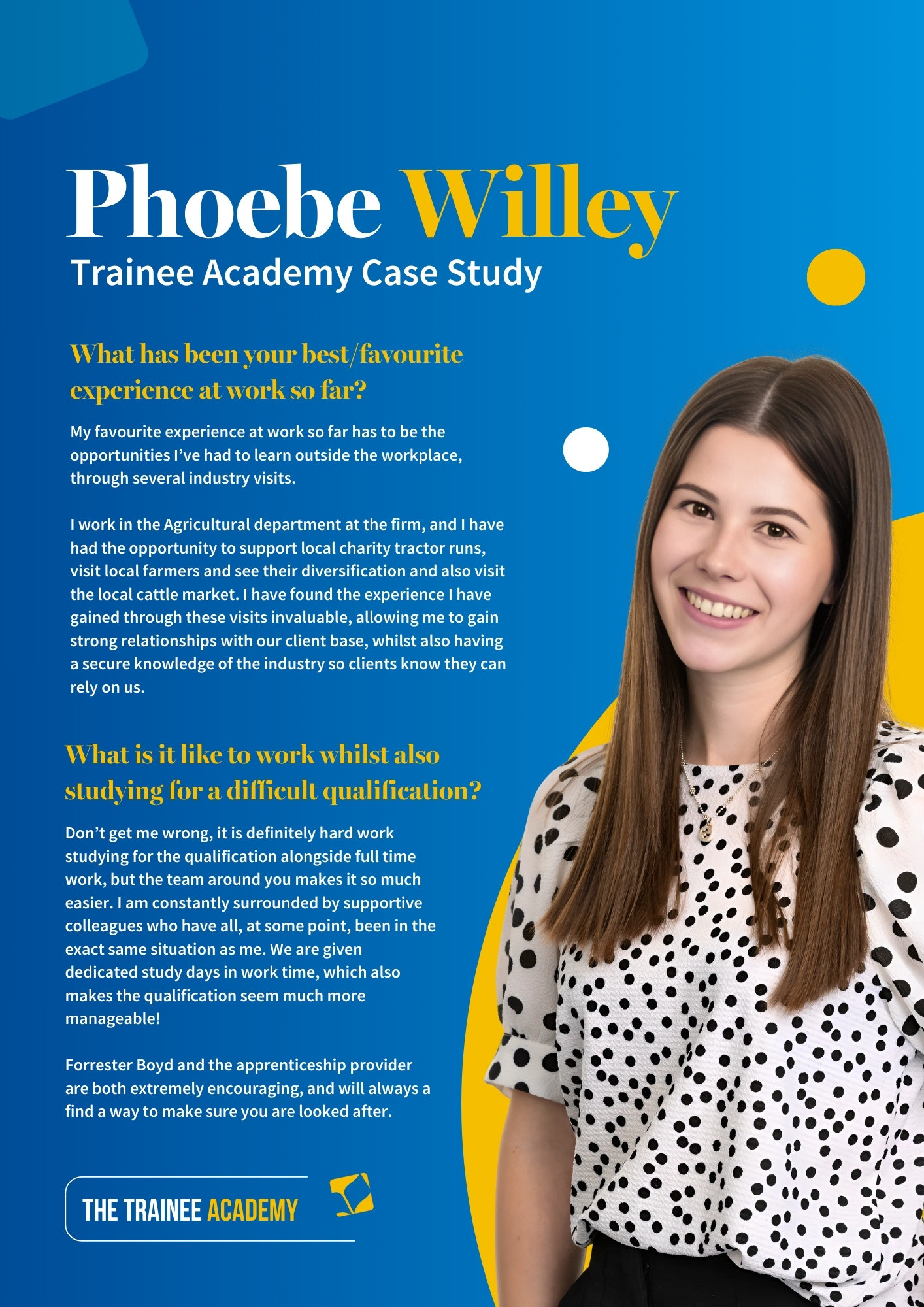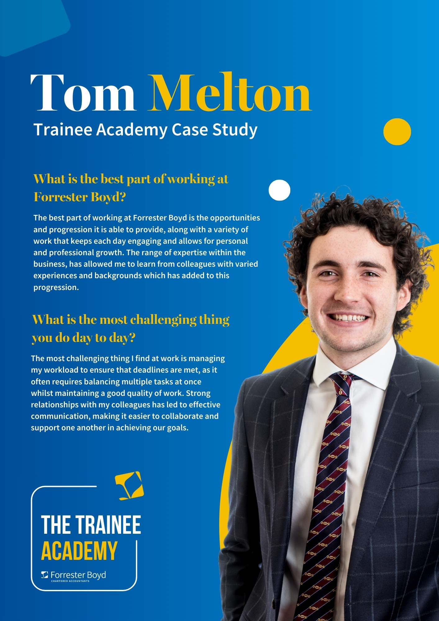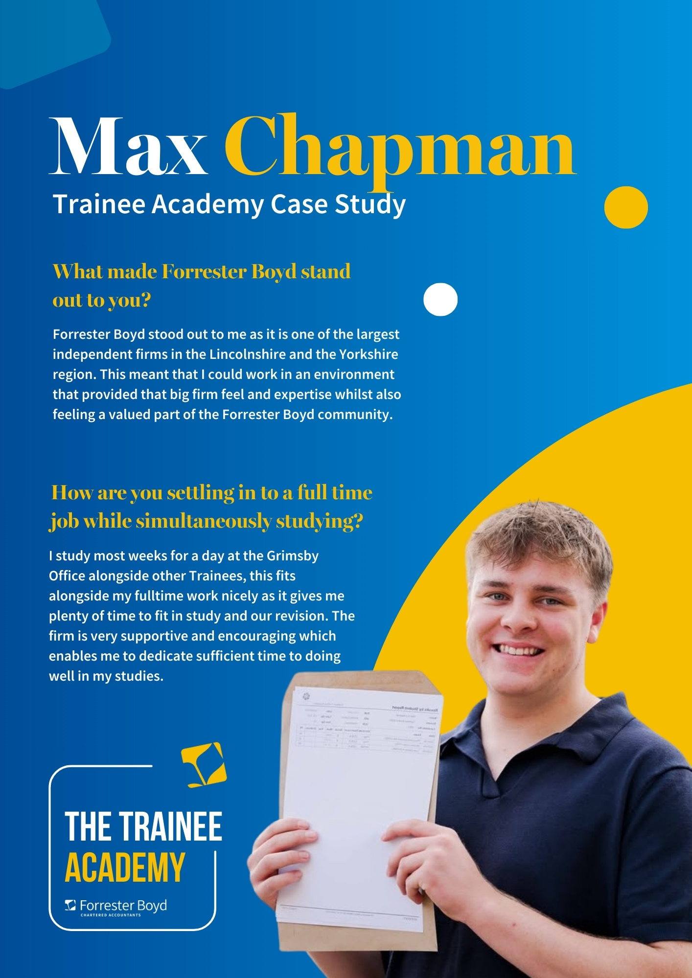 As part of the Forrester Boyd team, you will have a full-time role, receive dedicated study leave for exams, and we will even cover additional costs such as petrol, lunch, and hotel stays when you’re studying away from home.